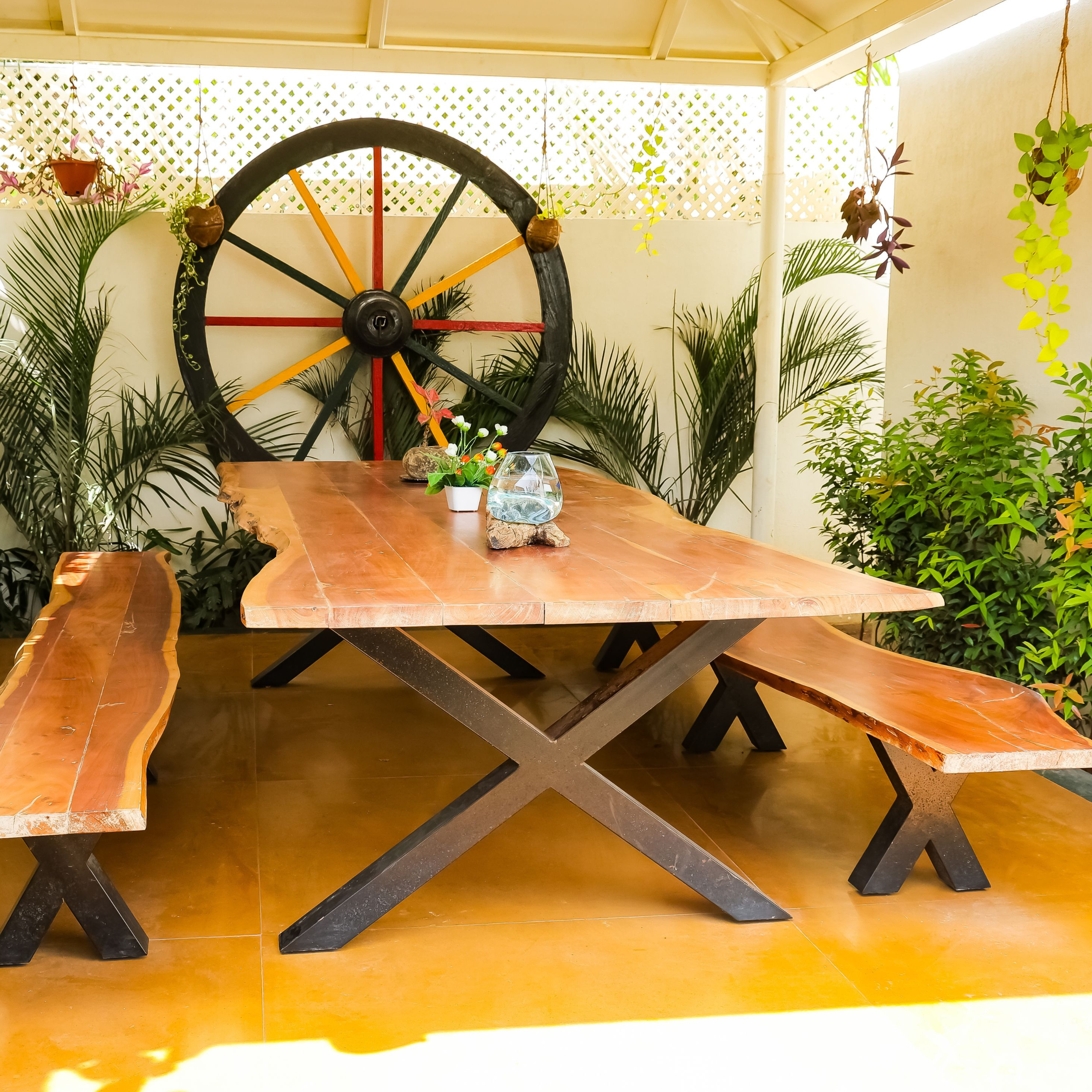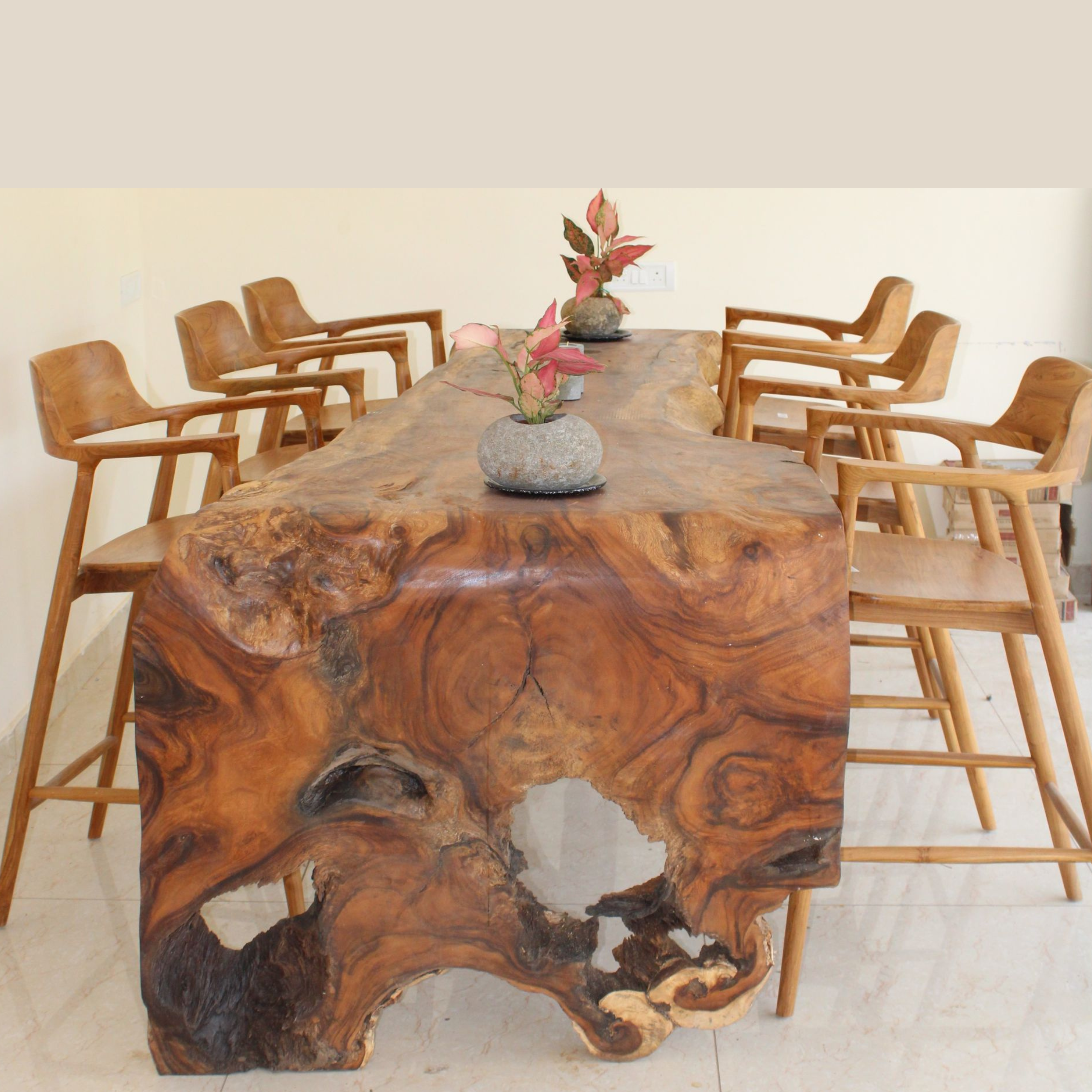 At Vajram, we offer a stunning array of natural wooden furniture and decor pieces meticulously crafted to enhance any living space. Our collection includes beautifully carved wooden tables, exuding warmth and character with their natural wood grains and unique designs. Complementing these tables are teak wood chairs and barstools, providing both comfort and style with their durable construction and elegant finishes.