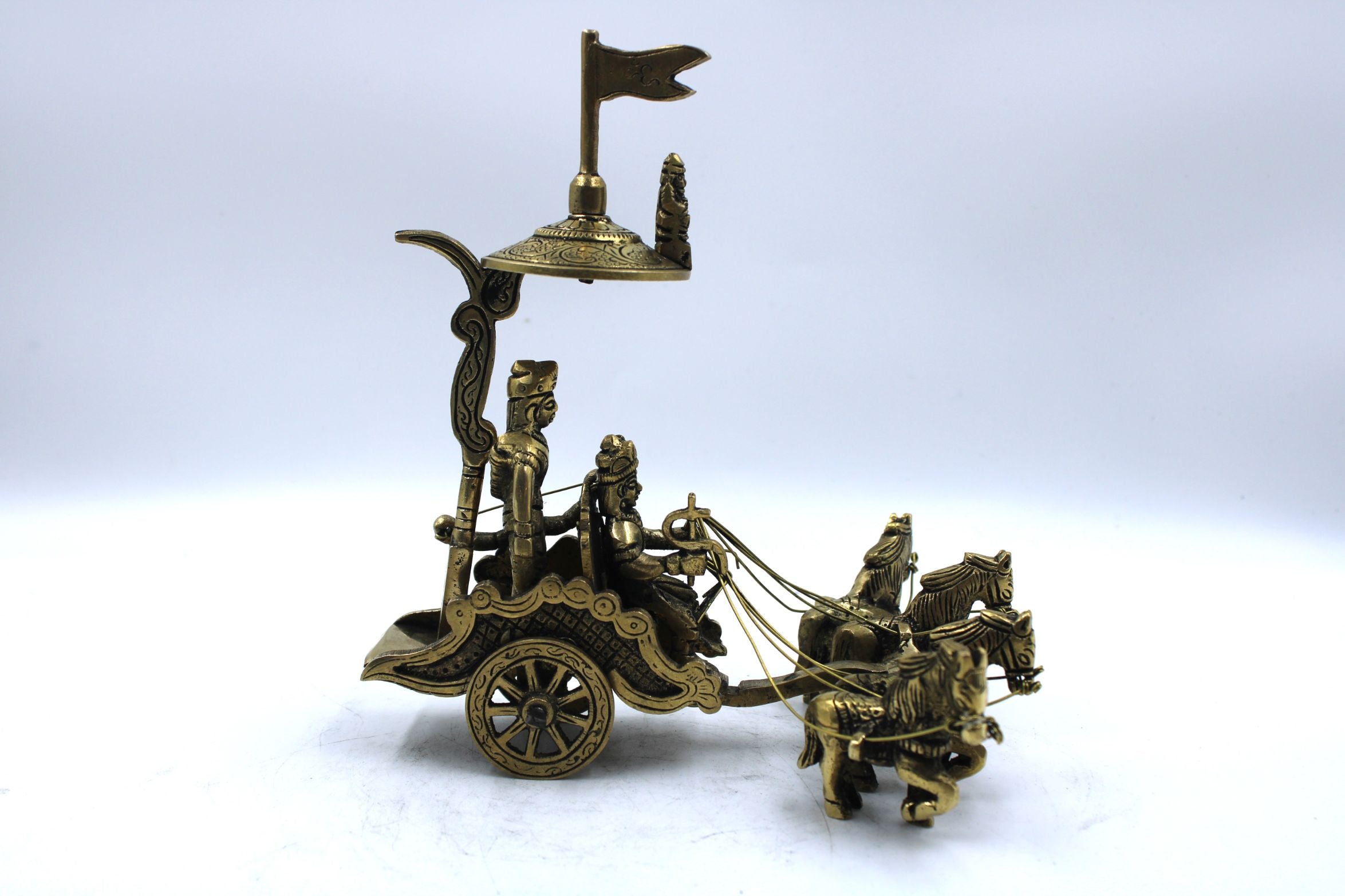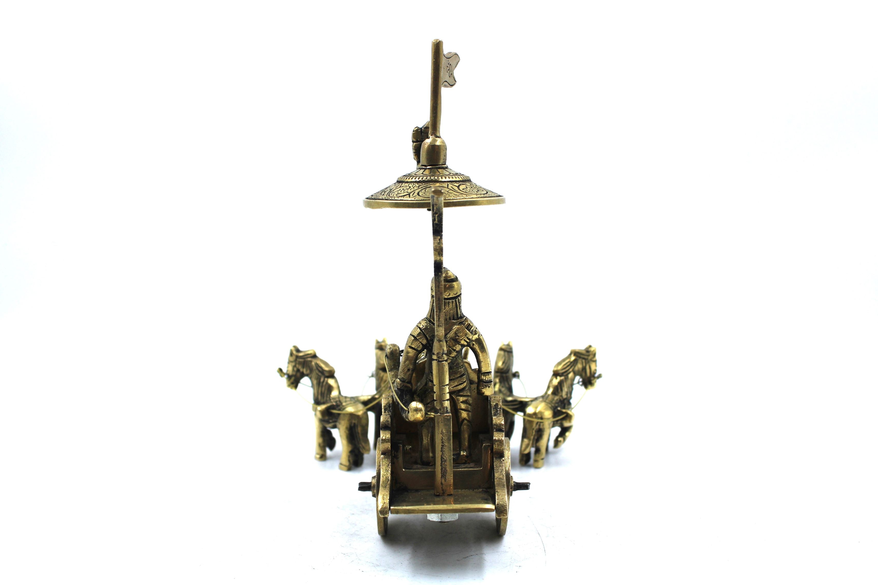 This beautiful Arjuna & Krishna on Rath has been crafted in pure brass by skilled artisians. This show piece depicts the mytholigical characters of Arjuna & Krishna in the scene of the most important chariotte scene in Mahabharatha.